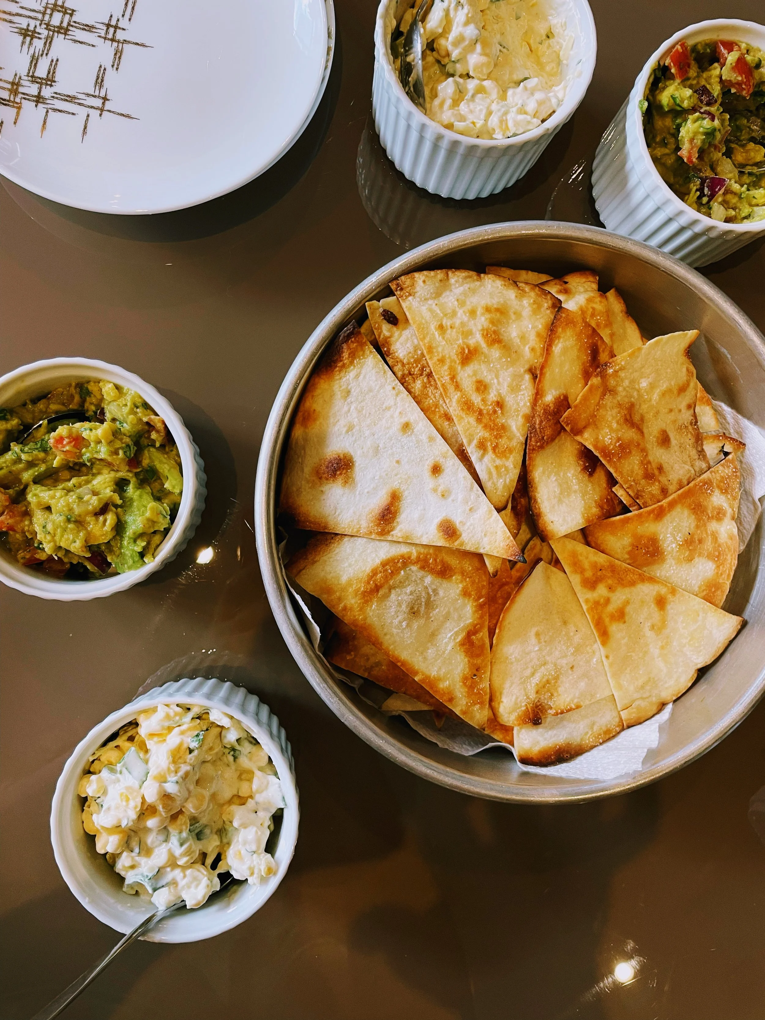 Since tortilla chips in the UK are not impressive to me, I opted to make my own: Cut up flour tortillas in triangles, heat neutral oil in a pan and fry the triangles until golden. Place on a paper towel-lined plate and season with salt while still hot.